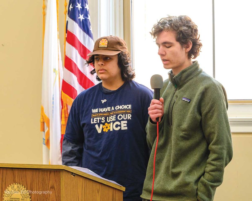 Melrose High School guidance counselor and MAAV Student Action Board advisor, Joe Parrillo, began the ceremony by welcoming the crowd and spoke of his students’ dedication to being part of the solution as he introduced MHS senior Sid McQuaid and MHS Junior Sidney Trzepacz who led the crowd in taking the White Ribbon Day pledge, a call to unity to do our part to end gender-based violence.