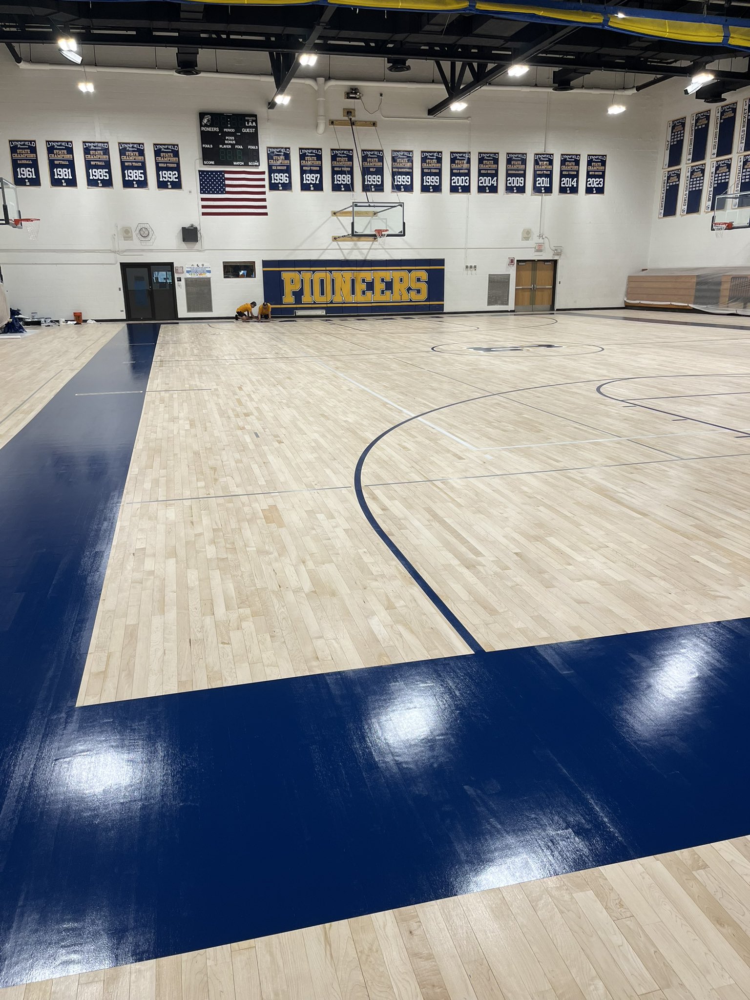 THE LYNNFIELD High gymnasium updates were concluded recently. The gym had a new court installed to finish up the project that started with new electric basketball hoops and updated banners. (LHS Athletics Photos)