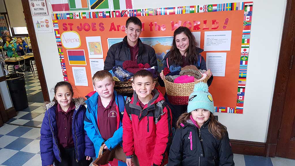 SAINT JOSEPH school students addressed 157 Valentine cards to be handed out by Pease greeters to incoming soldiers at Pease Airport, N.H. 97 hand-knit hats were also given. There is a great need for more hats. If interested in helping, please contact the school. Back row (from left): Mardin Minasian and Christine Hinds; front row (from left): Mierina Chankour, Aidan Murphy, Sean Murphy, and Gabby Guerriero.(Carolynne Dimare Photo)