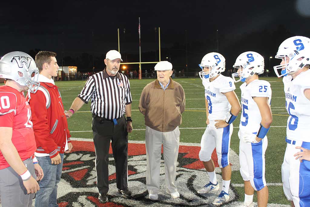 BILL TIGHE (center) was greeted with a hero’s welcome to Landrigan Field as he flipped the coin before the Wakefield- Stoneham game on Friday night. Tighe was the head coach of Wakefield from 1958 to 1964. (Dan Pawlowski Photo)
