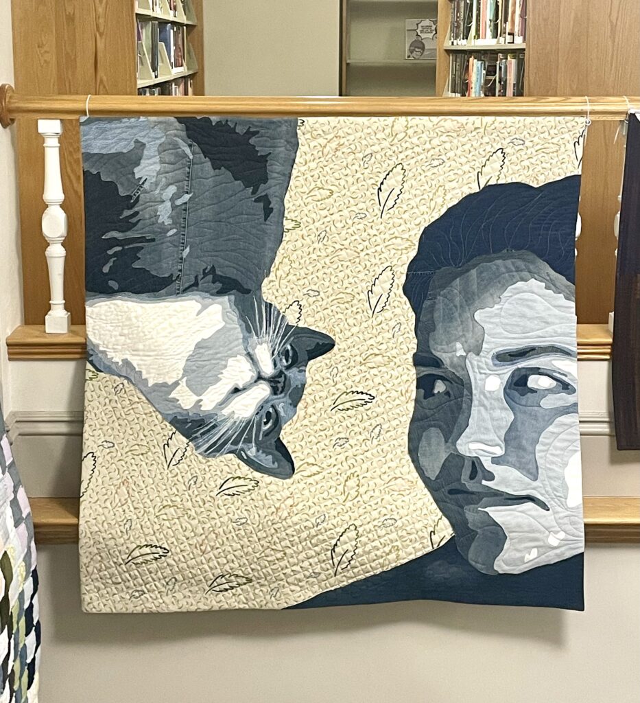 Each quilt is so unique from the next, telling a transformative story, from size, to color palette, to design. One quilt, titled “Stardust” by artist Susan McKinney features fabrics that are over a hundred years old. In another titled “Who’s got the button?” artist Jean Penta incorporated dozens of buttons into the design, some of which are antique buttons. The entire guild created a “Quilt Pot Pie” to which each member contributed as well. Be sure to read the artists’ statements posted on the second floor that go with each quilt!