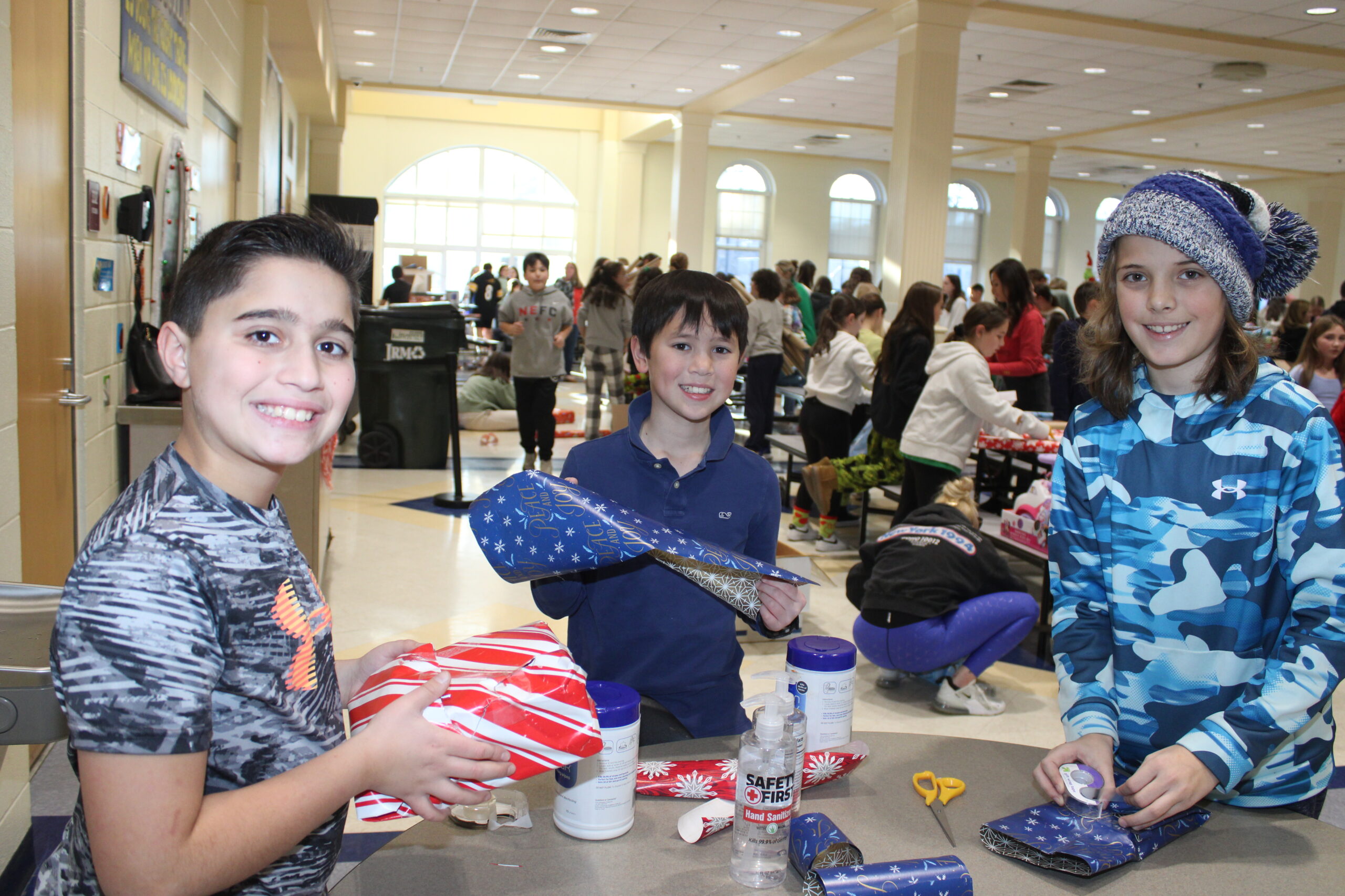 FIFTH-GRADERS, from left, Luca Travaglione, Luke Delaney and Chase Hillos were smiling from ear-to-ear while wrapping presents during Lynnfield Middle School’s annual Holiday Gift Drive on Dec. 20. (Dan Tomasello Photo)