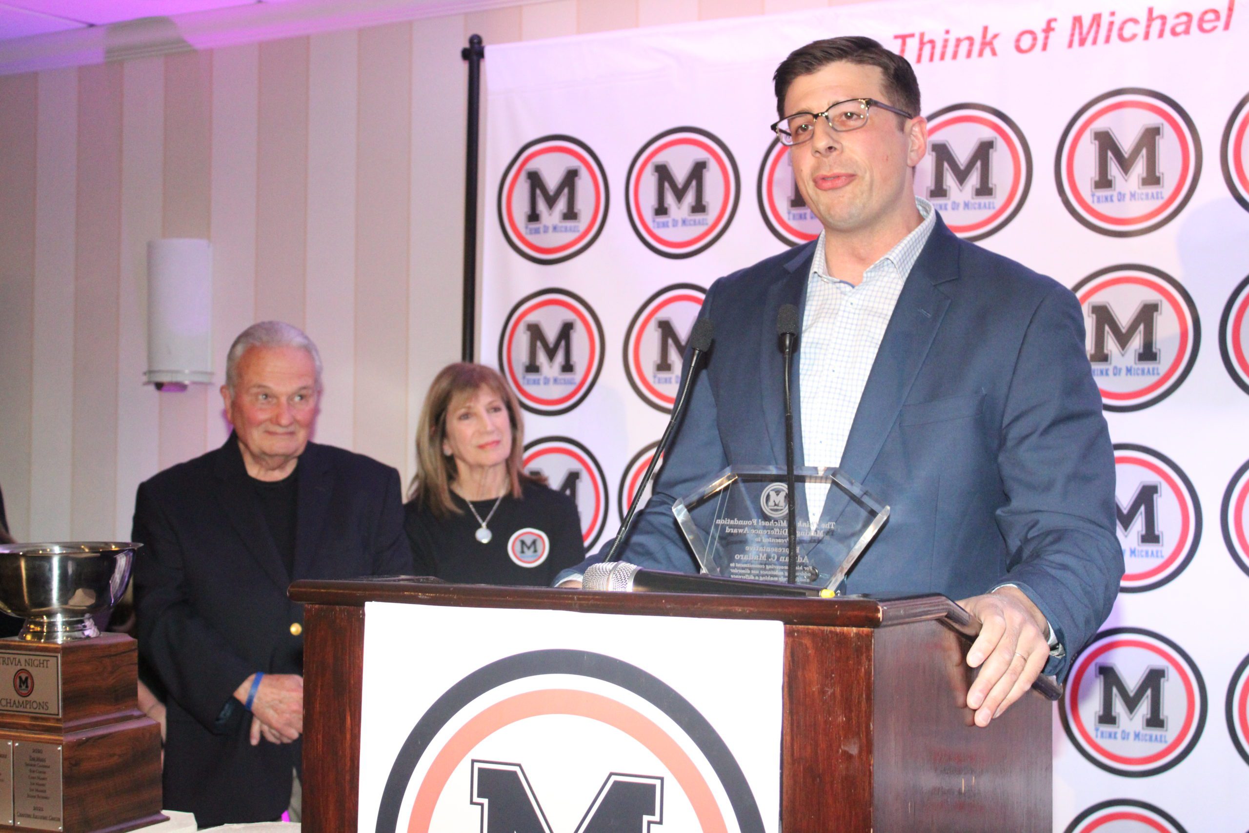 STATE REP. Adrian Madaro (D-East Boston) accepts the Michael V. Dalton Making a Difference Award while Think of Michael Foundation Treasurer Dick Dalton and Think of Michael Foundation President Carmela Dalton look on with pride during the fourth annual Trivia Night fundraiser on May 19. (Dan Tomasello Photo)