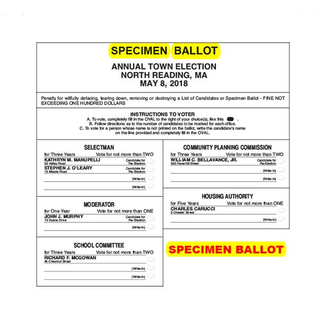 A specimen ballot appears in today’s Transcript along with candidate statements from Carucci, Bellavance and Carroll. Last week’s Transcript had candidate’s statements from O’Leary, Manupelli, McGowan and Boutwell.