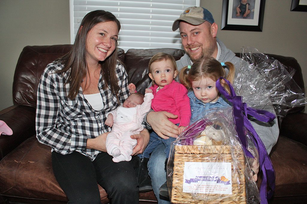 As the winner of the first baby contest, the Carrolls were presented with a pretty gift basket of prizes to welcome baby Morgan. They were amazed by the collection of gifts it contained and expressed their thanks to the following businesses for their generosity: Abbott Shoe – $40 gift certificate; A Touch of Class Salon – free haircut and blow dry for mom and dad; Advanced Touch Massage Therapy – free half–hour massage for mom; Walmart, North Reading – one car seat for baby; The Savings Bank, North Reading branch – $25 savings account for baby.
