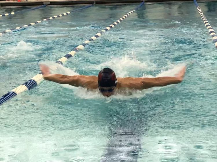 EVAN CHAN competes in the 100-yard butterfly against Triton on Sunday, in which he came in 2nd place. Chan also took 1st in the 50-yard freestyle and helped the 200 free relay take 1st and the 400 free relay take 2nd. (Courtesy Photo)