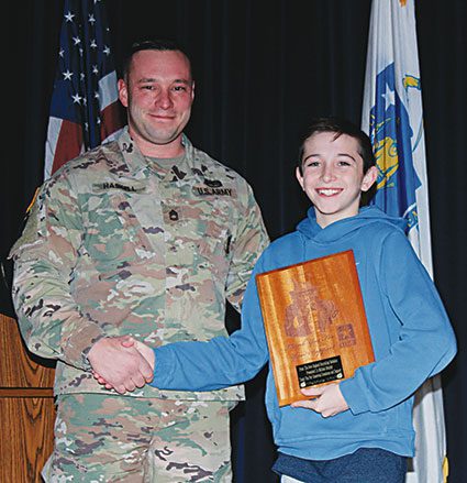 U.S. ARMY Sgt. 1st Class Nick Haskell gave LMS seventh-grader Michael Murphy a plaque in order to thank him for holding a fundraiser for soldiers and veterans. The Army recognized Michael during a grade-level assembly just before Christmas Vacation. (Dan Tomasello Photo)