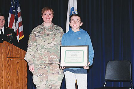 Mathews attended the ceremony along with Sgt. 1st Class Nick Haskell, Staff Sgt. Stephen Boggs, Sgt. 1st Class Nick Walters and Capt. Carrie Haag. Mathews told the seventh-graders that Michael displayed kindness, effort and citizenship by going “above and beyond for the veteran community.”