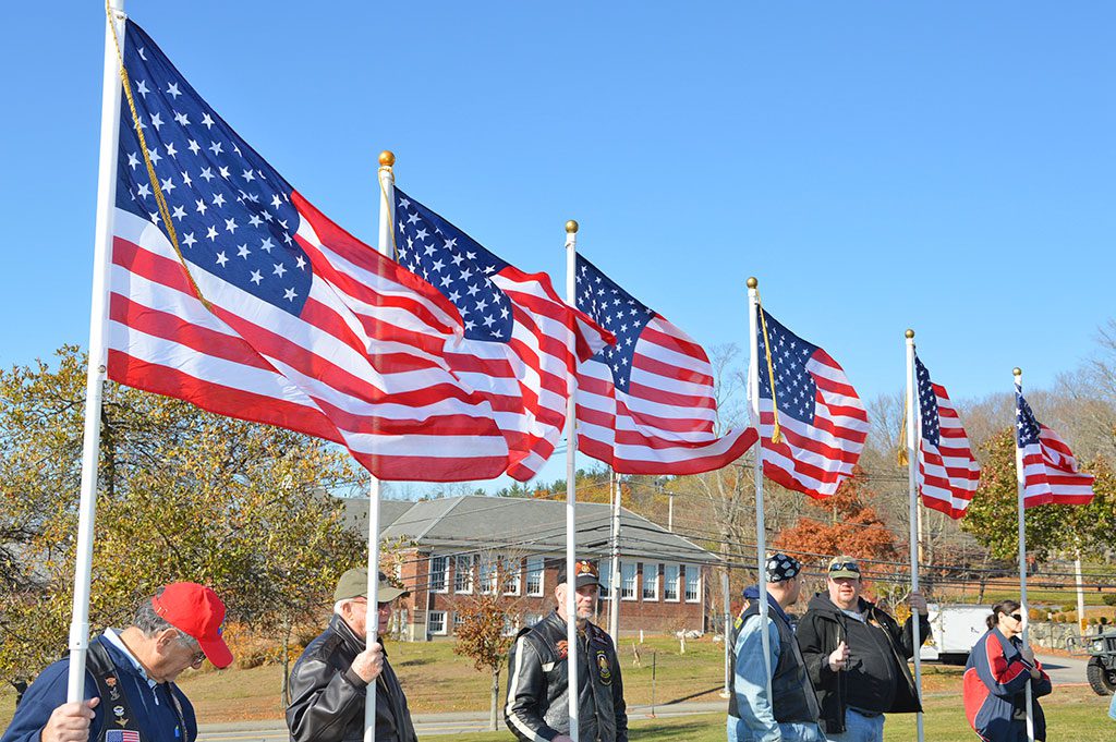 PROUDLY WE HAIL. A ring of American flags on the town common carried by Patriot Guard Riders symbolize the patriotic sentiments of North Reading on Veterans Day. (Bob Turosz Photo)