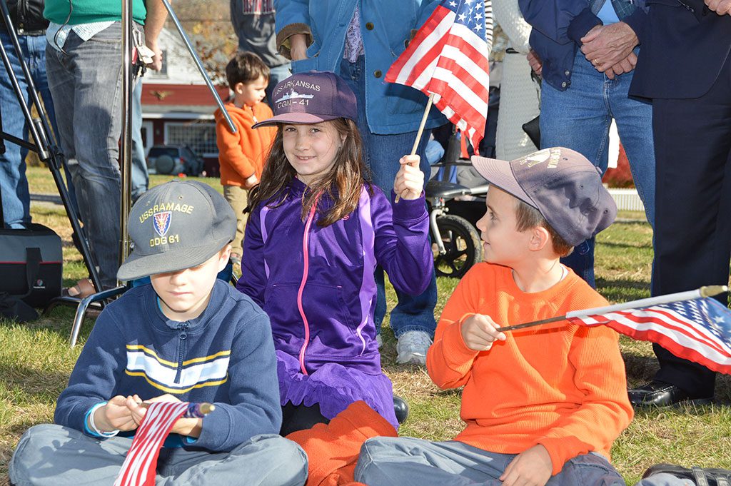 YOUNG PATRIOTS. Jonah, Eva and Elijah Roberts celebrate Veterans Day along with crowd of about 200 during ceremonies on the town common Tuesday morning. (Bob Turosz Photo)