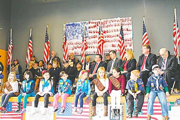 Moved indoors due to a biting wind and cold temperatures, those in attendance at the Batchelder School were treated to a fully decorated red, white and blue gymnasium created by the school’s entire third grade class for its own special Veterans’ Day assembly on Thursday. The stage was further enhanced by the Flags carried by the Patriot Guard Riders, which is a volunteer group of patriotic citizens, some of whom are veterans, some of whom are not, who upon invitation by families provide an honor guard at the funeral services of veterans.