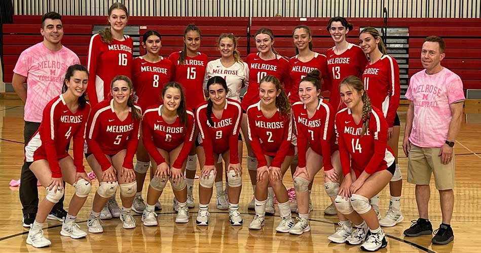 It was a spread out offensive effort that saw seniors Manon Marchais and Sadie Jaggers lead Melrose in kills with 9 kills each and Sabine Wentzel with 8. Setter Leah Fowke had a tireless 23 assists and 12 digs.