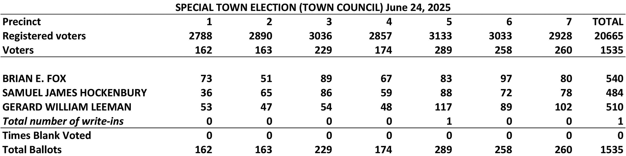 With just 7.4 percent of the town’s 20,665 registered voters participating on a brutally hot day, Fox unofficially received 540 votes over the town’s seven precincts. Second place finisher Gerard Leeman of Fox Road received 510 votes, with Emerson Street’s Sam Hockenbury finishing with 484 votes.