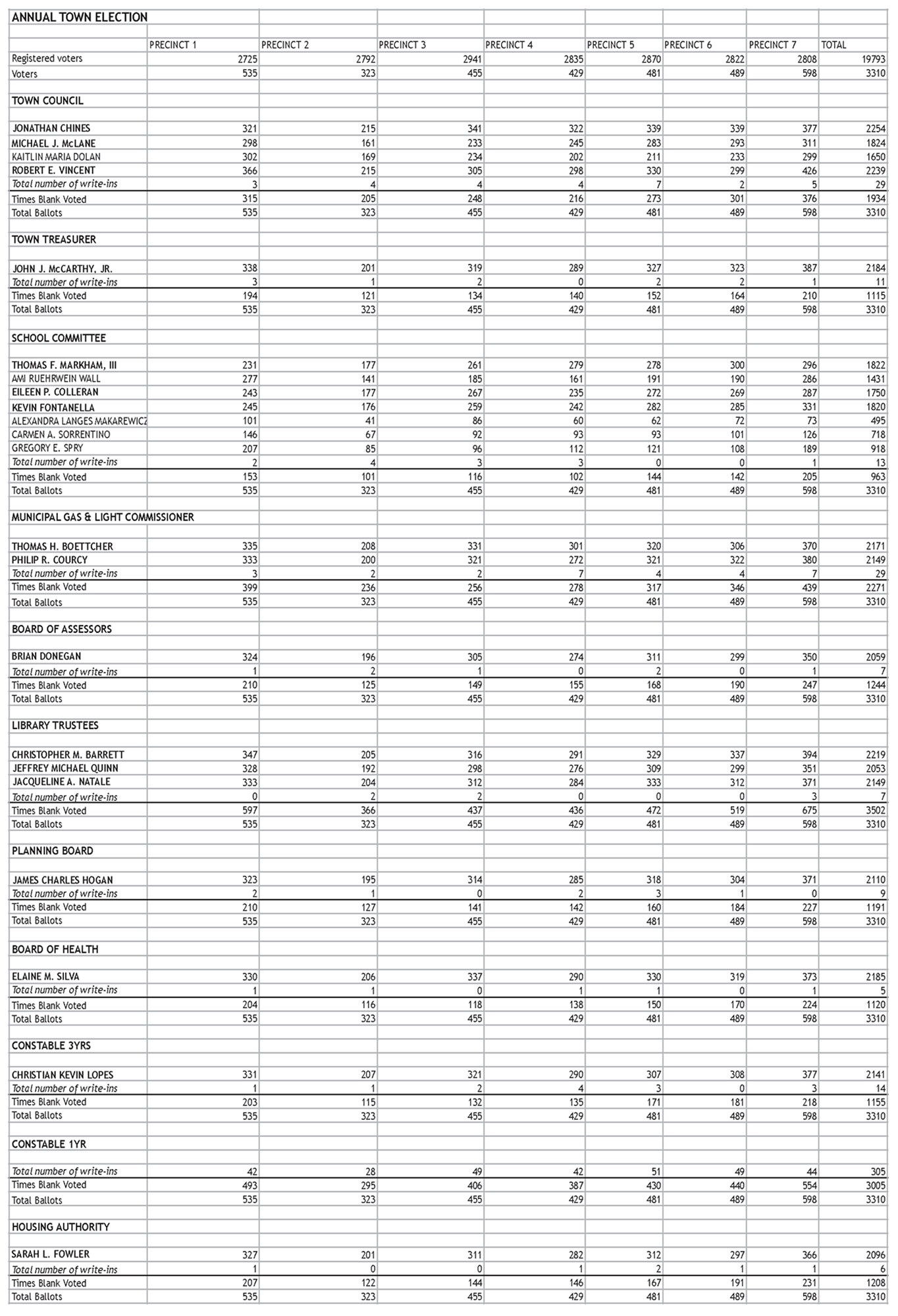 Chines topped the ticket for Town Council with 2,254 votes. Vincent was a close second with a vote total of 2,239. McLane picked up the third seat with 1,824 and Dolan came in fourth with 1,650 votes.