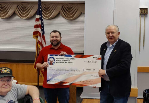 ON SATURDAY, the Wakefield Elks on Bay State Road served up a great breakfast for over 70 veterans and their families. The Elks also donated $4,000 to the Wakefield Veterans Relief Fund. Ralph Eaton (left), the Exalted Ruler of Elks Lodge 1276, presented a check to Wakefield Veteran Service Officer David Mangan to apply to the Veterans Relief Fund, established to financially assist veterans, spouses or veteran families in need when hardships arise. The Elks invest in their communities through programs that help children grow up healthy and drug-free, meet the needs of today’s veterans, and improve the quality of life. Local veterans are grateful for the support.