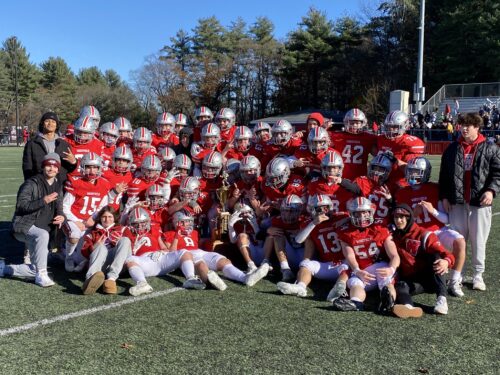 THE WARRIORS celebrate their third consecutive Thanksgiving Day victory over Melrose after the 63rd edition of the big game. Wakefield’s last-second goal-line stand, completed by an interception from Myles Sanchez, sealed a 7-3 victory. (WMHS Athletics Photo)