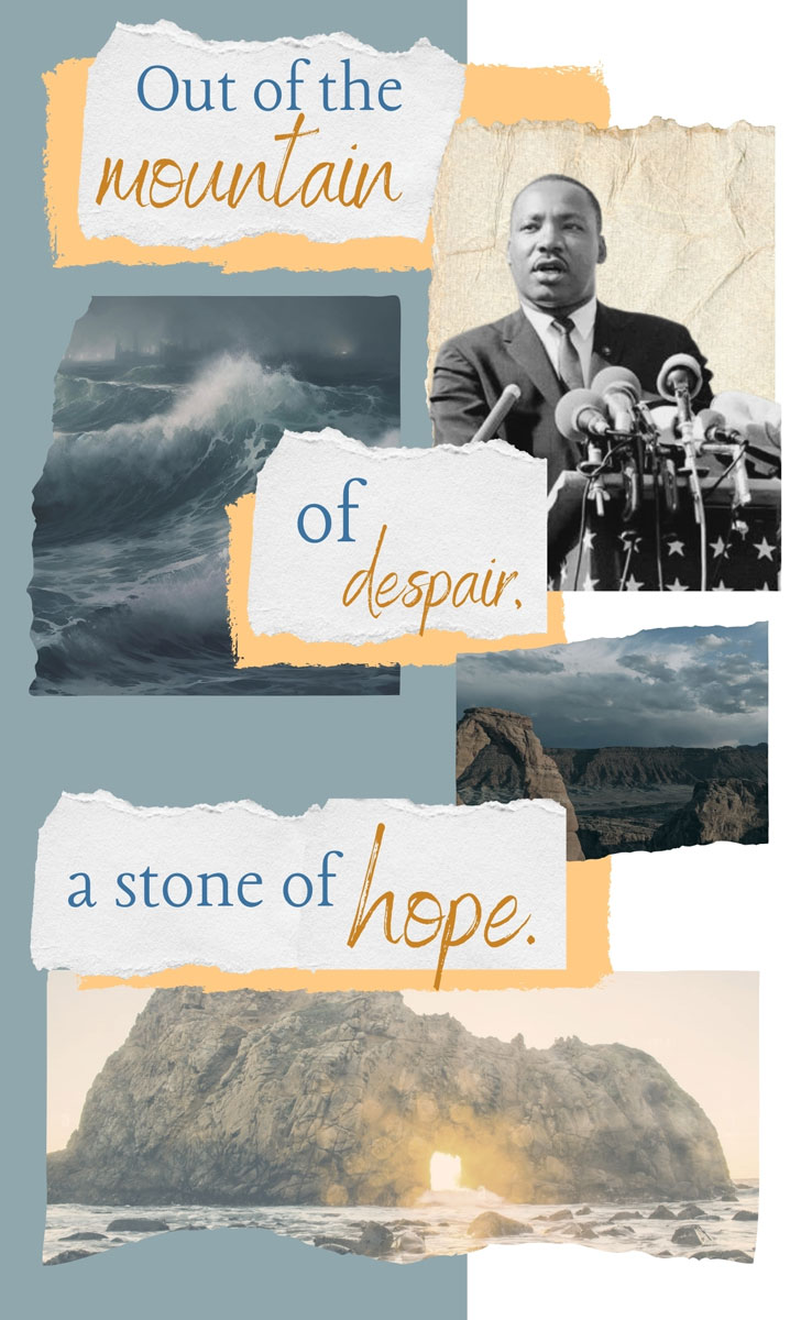 Each student chose a quote spoken by the activist to be the focus of a digital collage. They learned about text placement, font pairs, color schemes, digital editing, and more. The final products commemorate the life and work of Martin Luther King, Jr. and invite viewers to reflect on the ongoing struggle for civil rights.