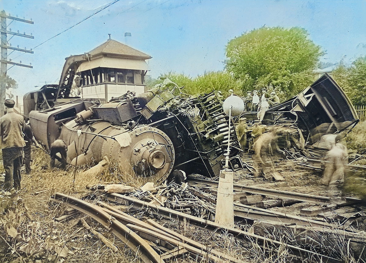 ONE OF THE worst train wrecks in Wakefield history occurred at 10:30 on the night of Aug. 2, 1917. The head-on crash at Wakefield Junction involved a freight train locomotive and a shifting engine. (A shifting engine was a smaller locomotive that was used to move rail cars short distances within a railroad yard.) A fireman on the freight train was killed when the locomotive fell on top of him. He left a wife and a two-week old baby. The engineer on the freight train suffered serious burns but survived. Several other crew members escaped injury by jumping to safety just before impact. According to the Aug. 3, 1917 Wakefield Daily Item, “The outward-bound freight train was traveling at good rate of speed and there was a heavy impact when the mammoth engines crashed headlong into each other.” The sound of the crash could be heard as far away as the center of town. Several tons of coal spilled when the train fell over. Traffic in the area was reportedly shut down all night and the first cars to pass were at 8 o’clock on the morning after the crash. Thousands of people were attracted to the scene and several hundred remained throughout the night to watch the removal operation.