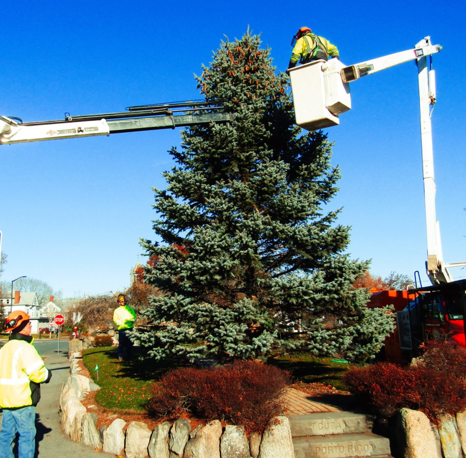 DPW WORKERS installed the 2021 Town Christmas Tree on the Rockery yesterday morning. The 30-foot tall blue spruce was donated by Cheryl Callahan of Walter Avenue. (Mark Sardella Photo)