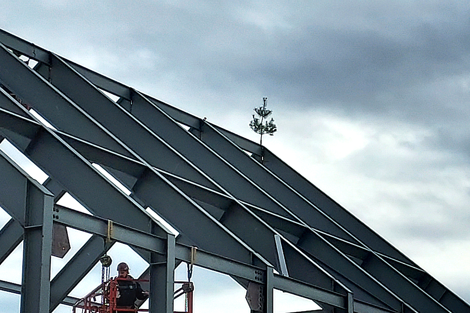 THE FRAMEWORK of the new First Baptist Church has been topped out with a small tree, signifying the safe completion of the framing of the structure, according to construction lore. (Robert Pushkar Photo)