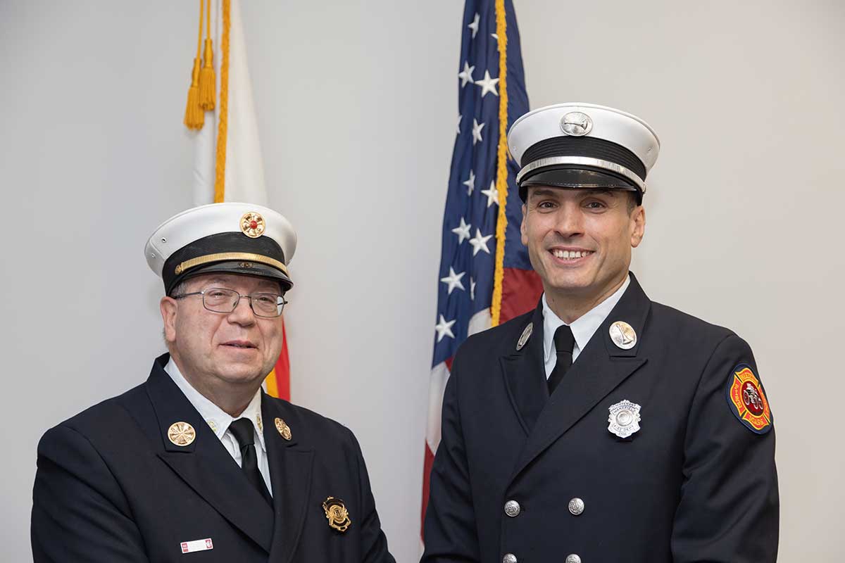 FIRE CHIEF MICHAEL SULLIVAN (left) with newly appointed Lt. Gerald Sancinito.