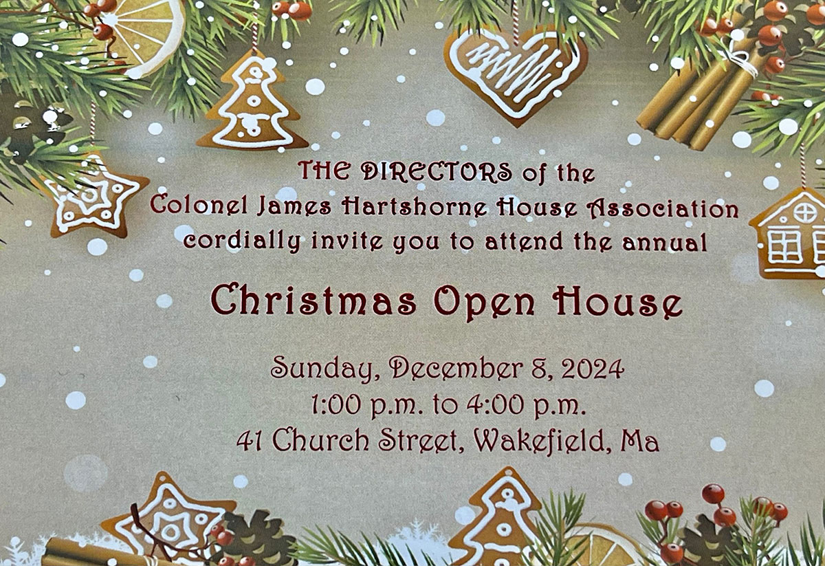 Complimentary Christmas cookies and beverages will be served and the spirit of holiday hospitality will reign at the historic home, beautifully decorated for the holiday season by volunteers from the Wakefield Garden Club and the Hartshorne House Board of Directors.