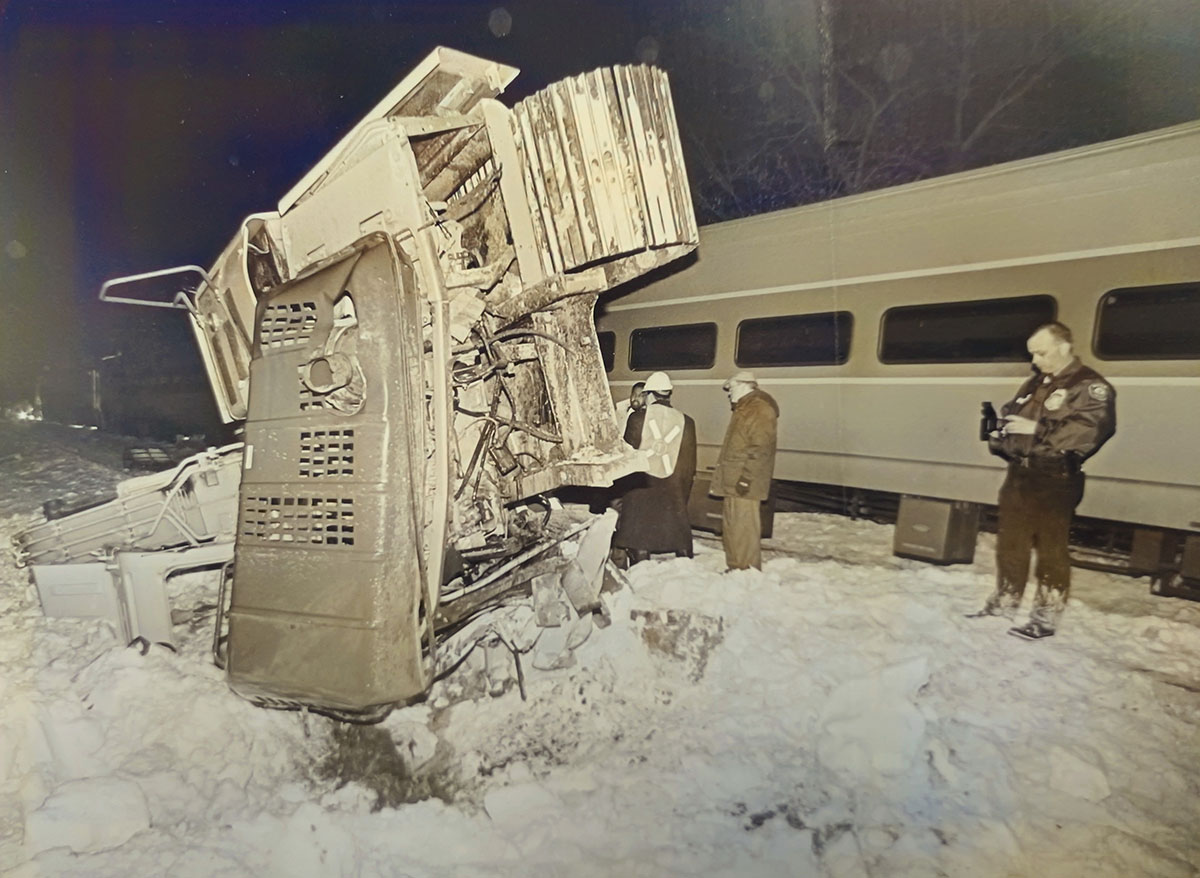 A WAKEFIELD POLICE OFFICER examines the wreckage of a Komatsu excavator in the wake of a train crash at the Forest Street crossing in Greenwood on Jan. 16, 1996. A Mack truck pulling a low-bed trailer carrying the the excavator got stuck on the tracks at about 5:30 p.m. as a train out of Boston was approaching with about 800 commuters on board. The gate attendant frantically waved flags at the approaching locomotive, but the express train, which did not have a scheduled stop in Greenwood, struck the trailer at about 40 mph. The excavator was thrown about 150 feet, landing on its side on the other set of tracks. The locomotive derailed but did not tip over. Several passengers were taken by ambulance to area hospitals. One woman was taken by MedFlight to Boston City Hospital. Many others were treated at the scene for bumps and bruises.
