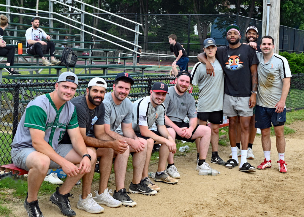 BRUCE BROWN, guard for the 2023 NBA Champion Denver Nuggets, visited friends at Veterans Field on Sunday afternoon during Broco Oil’s Men’s Softball League double-header. Brown (third from right in the photo) was a standout basketball and football player at Wakefield High for two years before transferring to Vermont Academy. He played college ball for the University of Miami. The Detroit Pistons drafted him in 2018. Brown was traded to the Brooklyn Nets in 2020 then signed with the Nuggets last July. Brown declined his $7.7 million player option for next season and is currently a free agent. (John Leone Photo)