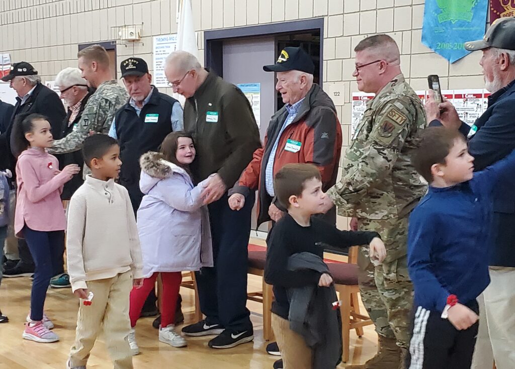 2nd Grader Blake Eno, hugs her grandfather, Anthony Perino, during the Woodville School Veterans Day celebration.
