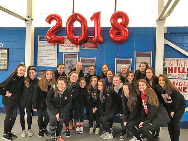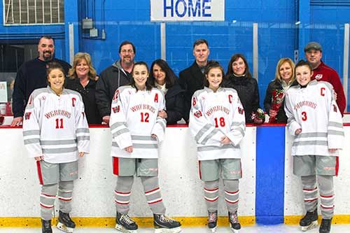 THE WARRIORS are on to the state tournament. On a night that belonged to the class of 2018, Wakefield’s seniors led the girls to the postseason with a resounding 6-2 win over Wayland/Weston. (@WMHSHOCKEY Twitter Photo)