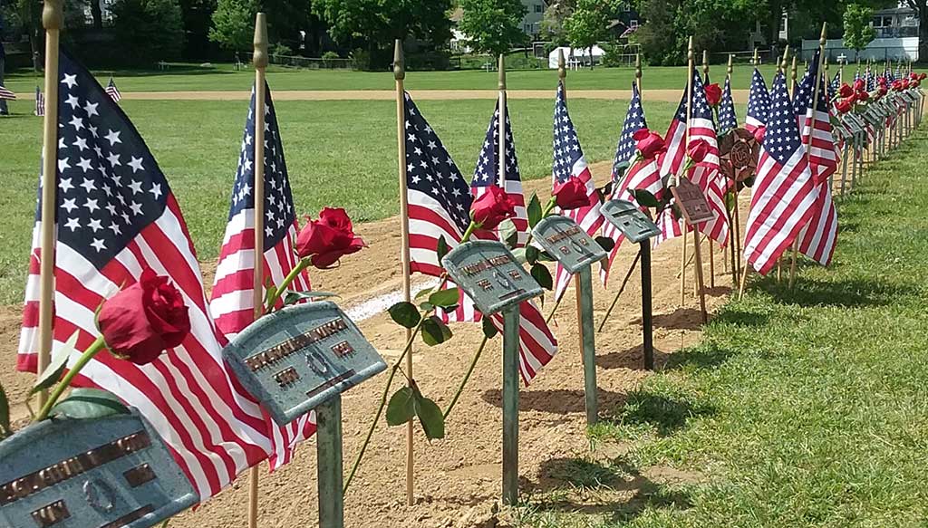 A line of sentries, many of them relatives or friends of the fallen, proceeded to take their places at each tree. As Bloom read the name of each hero, Woodville School second grader Grace Benson placed a red rose next to original plaques displayed on the infield.