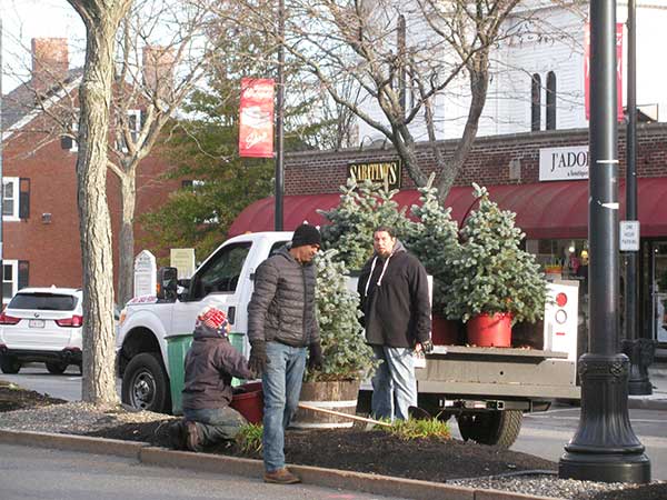 WORKERS FROM Norway Landscaping were installing miniature Christmas trees in the planters along the strip in the middle of Main Street in the Square this morning. (Mark Sardella Photo)