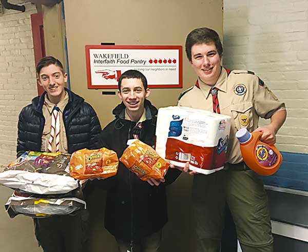 TROOP #701 Boy Scouts ran a highly successful food drive on behalf of the Wakefield Interfaith Food Pantry’s clients at the Shaw’s on Water Street on Saturday, February 10. The Boy Scouts educated shoppers about hunger and community members brought healthy foods for the food pantry’s clients; shoppers also made monetary donations as part of this community food drive. In photo (left to right), Ricky, Richard, and Max, on behalf of Troop #701. (Courtesy Photo)