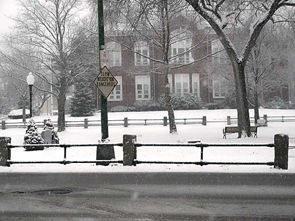 NO SOONER had we melted most of the snow that was on the ground than Mother Nature greeted morning commuters today with a fresh coating of the white stuff, as seen here looking at Town Hall across Main Street and Veterans Memorial Common. (Mark Sardella Photo)