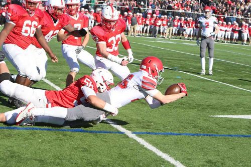 On first down from the Melrose 49, Lucey found senior co-captain Alex Joly for a 13-yard pass and catch. Marinaccio picked up 10 yards on the next play, and another 10 on a 2nd and nine from the 21. Senior Henry Stikeman gained six yards on a sweep to the right, bringing the ball to the five yard line. On a third and inches from the two, it was time for the seniors on the line (and not just Charlie) to take over, and they exploded through the Red Raider front seven, creating enough space for Lucey to sneak in for a touchdown.