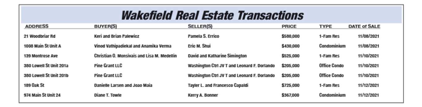 Wakefield Real Estate Transactions published November 29, 2021