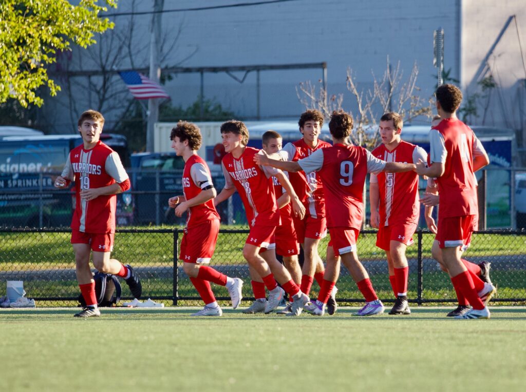 THE WARRIORS celebrate Mhamed Boukataya’s goal in their 2-0 win over Wilmington on Friday. (Melissa Estrella Photo)
