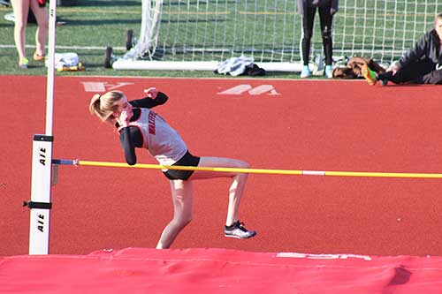 Sophomore classmates Olivia Fetherston, Maddy Melanson and Adriana Minasian then swept the high jump for the Warriors. Fetherston (5’) and Melanson (4’11”) both qualified for states while Minasian took 3rd (4’9”).
