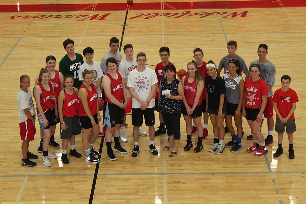 THE WARRIOR Basketball Clinic took place Wednesday, June 27 through Friday, June 29 at the Charbonneau Field House. The clinic was devoted to the drills and skills that make up the read and react offense used at all levels by both the Wakefield girls’ and boys’ basketball teams. All participants donated the clinic’s proceeds to the Wakefield Interfaith Food Pantry. Pictured, Maureen Miller, the Interfaith Food Pantry’s director of operations, accepts a check for $500 which will be used to purchase $2,000 worth of food at the Boston Food Bank. Pictured front center are next season’s WMHS girls’ basketball captains Hannah Butler and Jaime Greatorex and boys’ basketball captain Ryan Marcus. (Dan Pawlowski Photo)