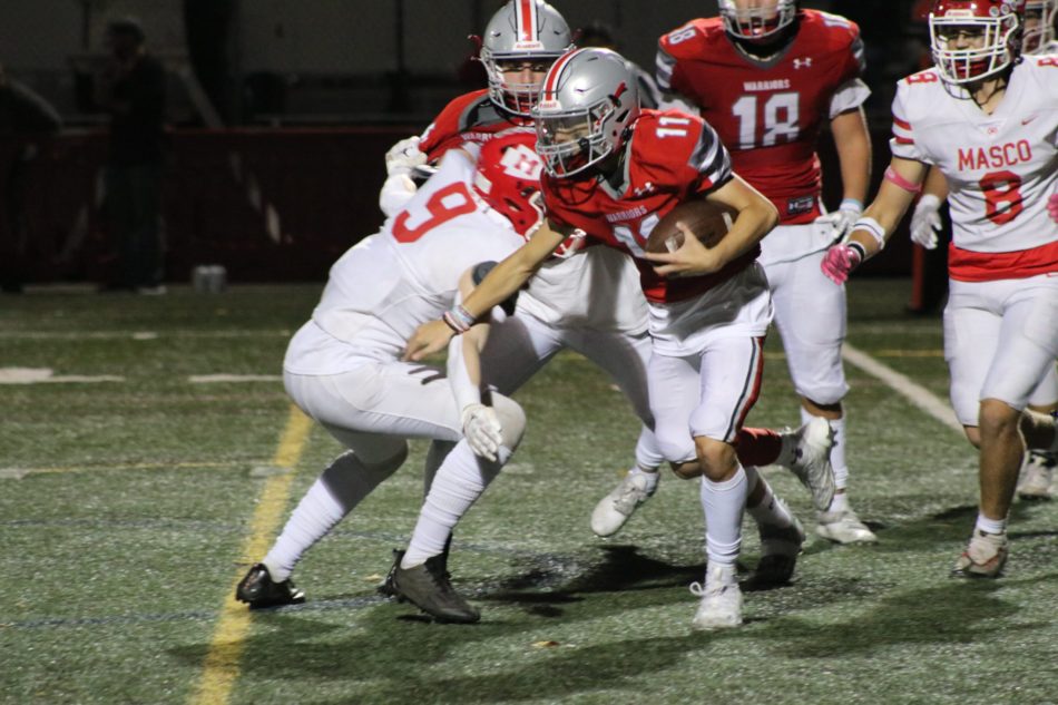 Masco’s offense connected on more punches in the second half, bringing to life their own, well-traveled fan base. Their first drive went 77 yards before a fumble on the Wakefield 2, forced by senior Kaiden Johnson and recovered by senior captain Christian Delgado, gave the Warriors the ball back at their own 1.