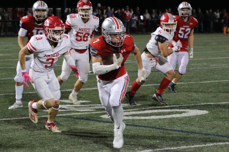 Masco’s defense stepped up again to force another punt and they got it back on their own 37 with 7:22 remaining. A methodical, 10-play, 63-yard drive in just over four minutes resulted in McMahon’s TD catch on 3rd-down after Nathan Delgado deflected it away from intended receiver Sam Nadworney and McMahon ended up in the right place.