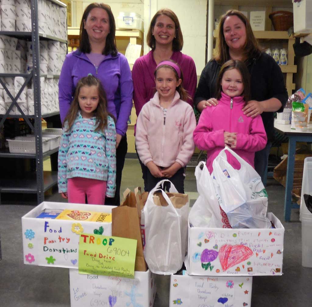 PHOTO: WIFP grateful to Girl Scout Daisy Troop May 18, 2015 WAKEFIELD Girl Scouts Daisy Troop members are shown with food donations for the Wakefield Interfaith Food Pantry. From left: Hailey Napoleone with mom Heather Napoleone, Amelia Griffin with mom Robyn Griffin and Allison Pesa with mom Karen Pesa.