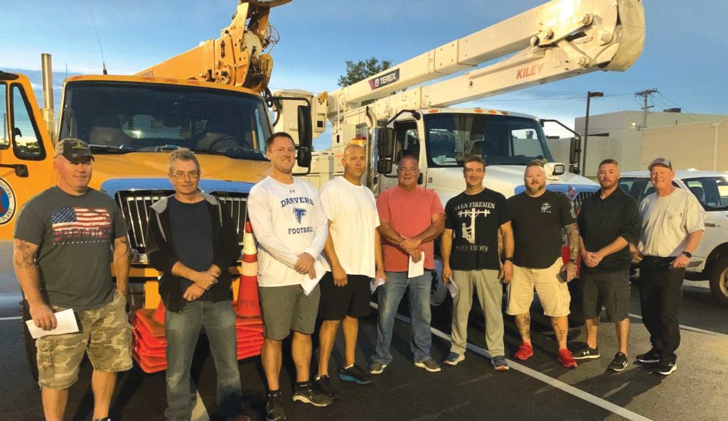 WMGLD LINEWORKERS Ralph Brown (center) and Nick DiPietro (second from right) and Superintendent Paul Redmond (right) along with their counterparts from Peabody Light, Reading Municipal Light Department and Danvers Electric will join other NEPPA and APPA crews in Florida in the next few days.