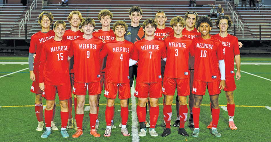 THE MELROSE High boy’s varsity soccer celebrated their seniors during Senior Night on Monday. Pictured are, top left: Owen Erelli, Gabe Dixon, John Arens, Matteo Giovanardi, Owen Mujalli, Aiden Barber, Brendan Radzik. Bottom: Dylan Terranova, Dante Lamentea, Owen Brodeur, Tyler Lecomte, Dan Muller and Emmanuel Samson. (photo by Raj Das edpohotos.com)