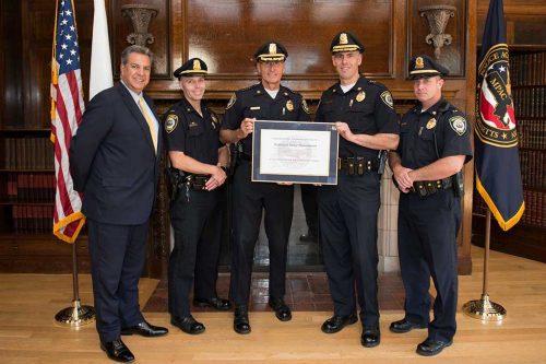 On Oct. 12, 2017, the Wakefield Police Department received state Certification from the Massachusetts Police Accreditation Commission for the third time since 2011. Attending the award reception were Police Chief Rick Smith, Deputy Chief Craig Calabrese, Lieutenant Scott Reboulet, Lieutenant Steve Skory, and Town Administrator Stephen P. Maio.
